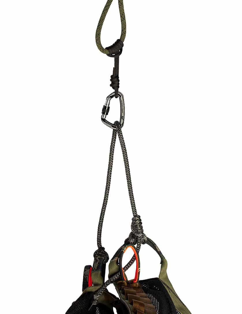 Take your hunting saddle setup to the next level with our adjustable AmSteel®-Blue bridge (in black fibers) that features a spliced eye on one end and a spliced-in stopper knot on the other. The saddle bridge attaches to the bridge loops by forming a Prusik knot on one side and feeds through a continuous loop of 5/32 Amsteel formed into a Prusik on the other bridge loop.